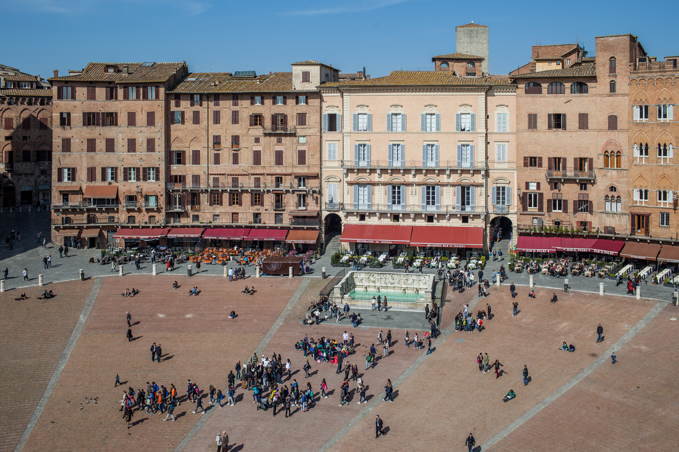 Empfohlene Route: Durch den mittelalterichen historischen Stadtkern Sienas winden sich viele enge und kurvige Gassen zwischen massiven Mauern der adligen Gebäude auf- und abwärts. Fast an jeder Ecke kann man von einer besonders malerischen Blick überrascht werden. Das Herz der Stadt ist der Piazza del Campo, der von dem massiven Rathaus beherrscht wird. Unter den Sehenswürdigkeiten, die den Platz auf der gegenüberliegenden Seite des Rathauses umgeben, findet man die S. Pietro Gasse, die zum Croce del Travaglio führt. Am Croce del Travaglio treffen sich die Hauptstrassen, nämlich die Via di Citta, Via dei Banchi di Sotto und die Via dei Banchi di Sopra. Die Via die Bianchi di Sopra führt bergauf an einigen schönen Gebäuden vorbei (z.B. Palazzo Tolomei, XIII. Jahrhundert) bis zum Salimbeni Platz, wo der gotische Salimbenipalais liegt. Die Via della Sapienza, die man links von Salimbeni findet, führt zu S. Domenico. Vor dem Platz führt die Via dei Rossi zur Francescokirche. Kehrt man zurück zur Croce del Travaglio, kann man links die Via Bianchi di Sotto einschlagen (Universitätspalais, XVI. Jahrhundert, Piccolominipalais) und erreicht die Logge del Papa (Papstresidenz, XV. Jahrhundert). Folgt man weiter der Via del Porrione, Via S. Martino und der Via dei Servi kommt man zur Kirche S. Maria Dei Servi.